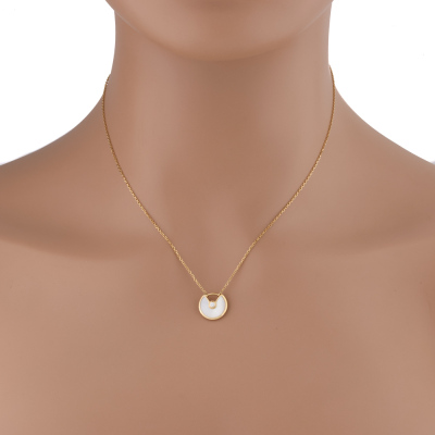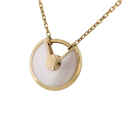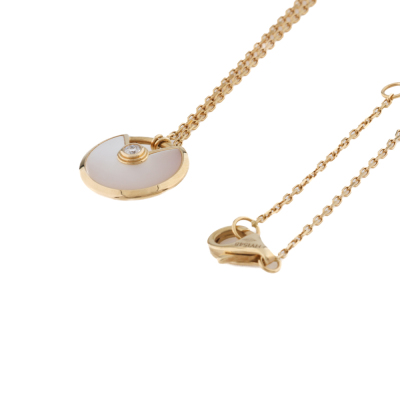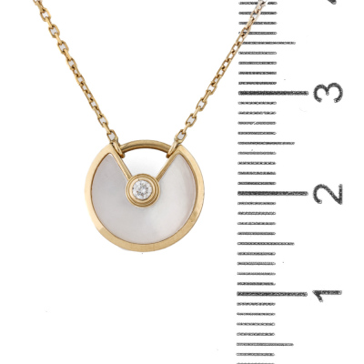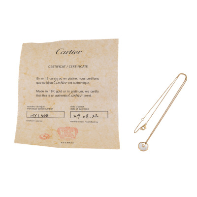 Amulette de Cartier Necklace, XS model with Mother of Pearl inlay and round Natural Diamond of approximate 0.04ct. Motif size: 12mm. 18ct yellow gold with Cartier 18ct yellow gold attached chain. Length: 37.5cm - 41cm. Cartier Certificate dated 22/08/2019
