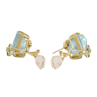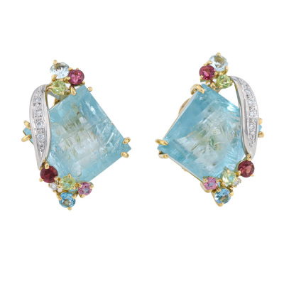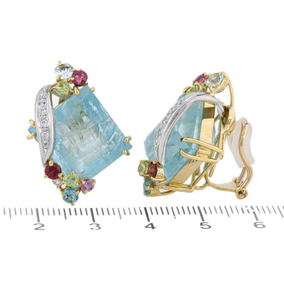 Clip-on earrings (with foldable posts for both pierced & non-pierced ears) with rough top rectangular cut Natural Aquamarines totalling 31.31ct, multicolour round Natural Gemstones (including Peridot, Rhodolite Garnet, Blue Topaz, Pink Tourmaline & Aquamarine) totalling 1.46ct and round Natural Diamonds totalling 0.12ct. 18ct yellow gold & Platinum-900. Weight: 19.2g.