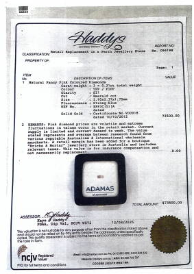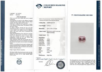 A loose emerald cut Argyle Origin Natural Pink Diamond of 0.12ct With Copy of Haddy’s Valuation Report dated 12/08/25 stating 5PP colour and SI1 clarity from a parcel of three Diamonds totalling 0.31ct. With GSL Report graded as Natural Fancy Intense Purplish Pink VS1 #AA71539/3. Origin: Argyle Deposit, Western Australia). (Pre-owned)