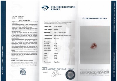 A loose pear shape natural Argyle Origin Diamond of 0.04ct (With GSL Report graded as Natural Fancy Deep Pink P1 #AA69242/2. Origin: Argyle Deposit, Western Australia). (As New)