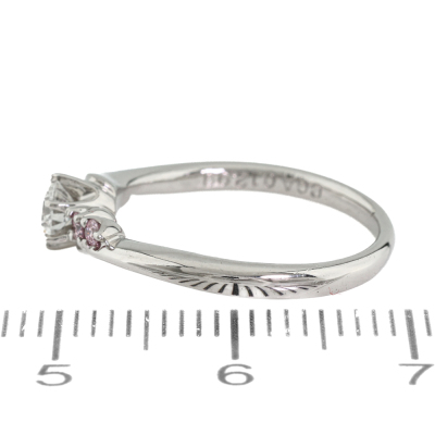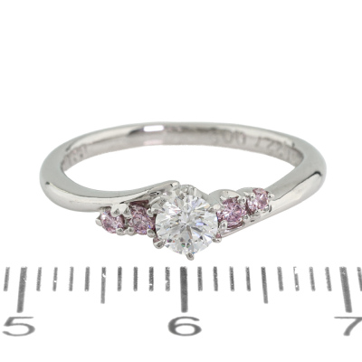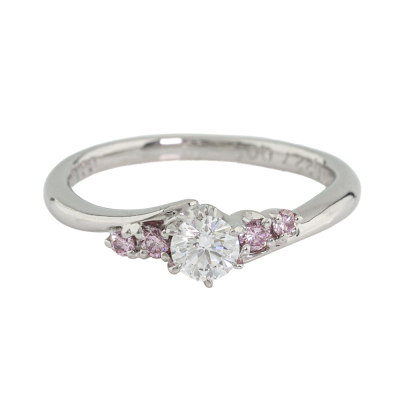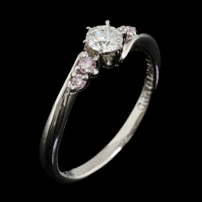 Diamond ring with 4 round Argyle Origin Natural Pink Diamonds totalling 0.09ct (One of 0.028ct Diamond with GSL Report graded as Natural Fancy Intense Purplish Pink P1 #AA71693/7. Origin: Argyle Deposit, Western Australian) and a centre round brilliant cut Natural White Diamond of 0.22ct. Platinum 950. Ring size I 3/4. Band width: 1.6mm-1.8mm. Weight: 3.4g.