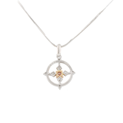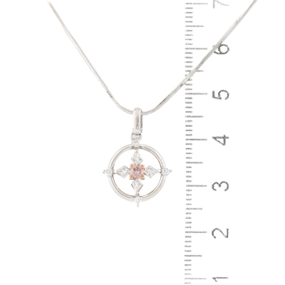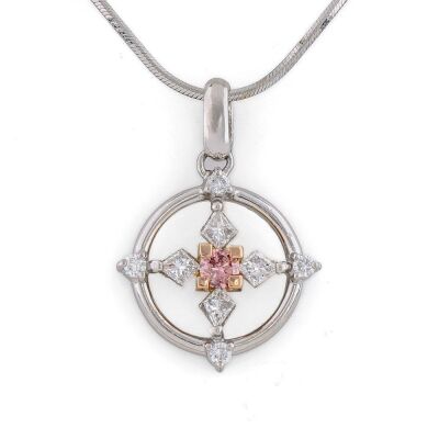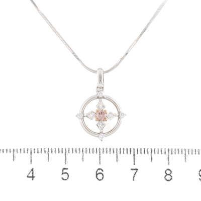 Diamond pendant with centre round Argyle Origin Natural pink Diamond of 0.087ct (with GSL Report graded as Fancy Intense Pink Rose P1 #AA71120/6. Origin: Argyle Deposit, Western Australian) and round & Kite cut Natural Diamonds totalling 0.35ct (Estimated grading: G-H SI-P1). Platinum 850 with 45.5cm Platinum 900 chain. Weight: 7.1g. (Pre-owned)