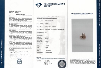 A loose heart shape Argyle Origin Natural Diamond of 0.06ct (With GSL Report graded as Natural Light Pink Champagne SI1 #AA 69397/3. Origin: Argyle deposit, Western Australia). (As New)