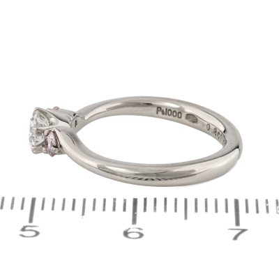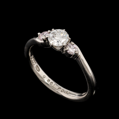 Diamond dress ring with 2 round Argyle Origin Natural Pink Diamonds totalling 0.10ct (One of 0.065ct with GSL Report graded as Natural Light Pink VVS2 #AA71120/3. Origin: Argyle Deposit, Western Australian) and centre round Natural Diamond of 0.36ct (Estimated grading: G VS). Platinum - 1000. Ring size I 3/4. Band width: 2.4mm - 2.0mm. Weight: 4.7g.