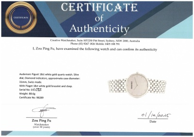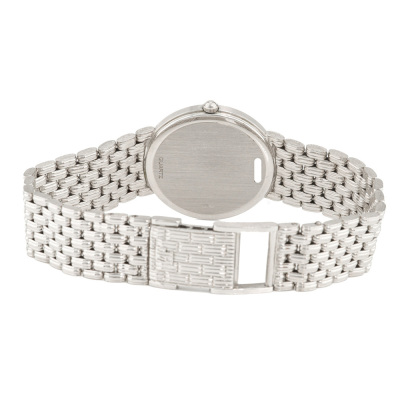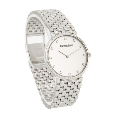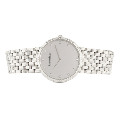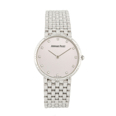 Audemars Piguet 18ct white gold quartz ladies watch. Silve dial, Diamond indicators, approximate case diameter: 31mm, max wrist size: 19cm, Swiss made. With Piaget 18ct white gold bracelet and clasp. With Certificate of Authenticity. 3 month FSA warranty. Weight: 88.6g. (Pre-owned)