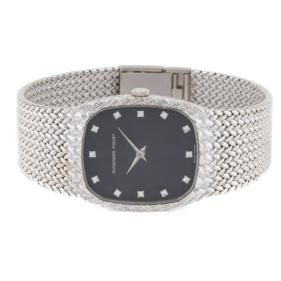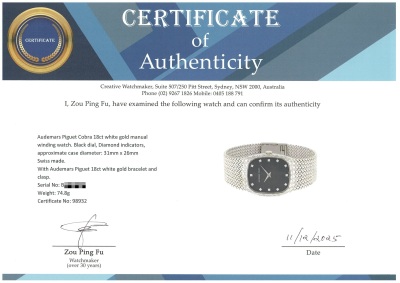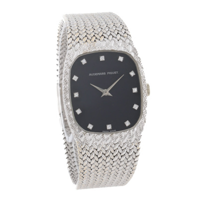 Audemars Piguet Cobra 18ct white gold manual winding watch. Black dial, Diamond indicators, approximate case diameter: 31mm x 26mm, adjustable max wrist size: 16cm, Swiss made. With Audemars Piguet 18ct white gold bracelet and clasp. With Certificate of Authenticity. 3 month FSA warranty