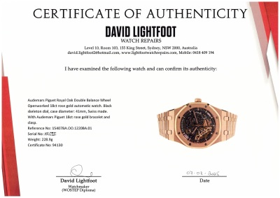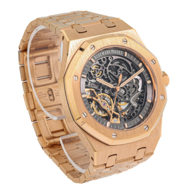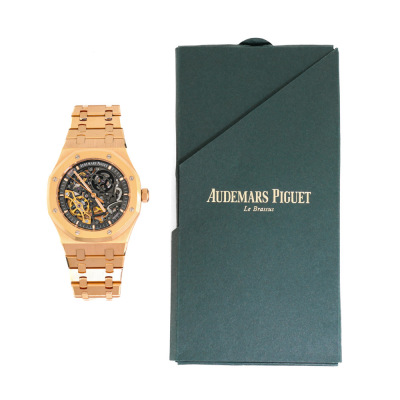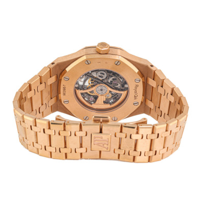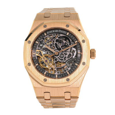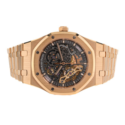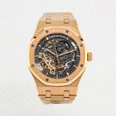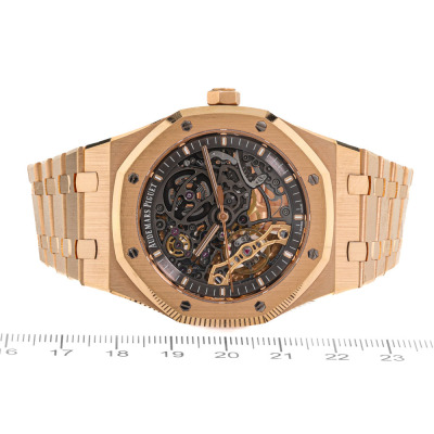 Audemars Piguet Royal Oak Double Balance Wheel Openworked 18ct rose gold automatic mens watch. Black skeleton dial, case diameter: 41mm, wrist size: 18.5cm, Swiss made. Ref# 15407OR.OO.1220OR.01, Circa: 2016-2023. With Audemars Piguet 18ct rose gold bracelet and clasp. With Certificate of Authenticity, undated Audemars Piguet International Warranty card and Audemars Piguet box. 3 month FSA warranty (Pre-owned)
