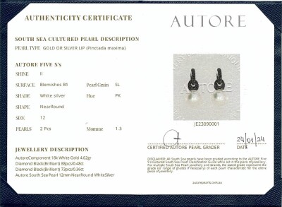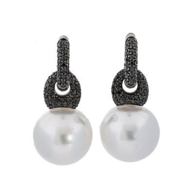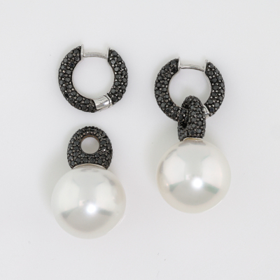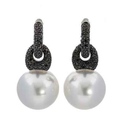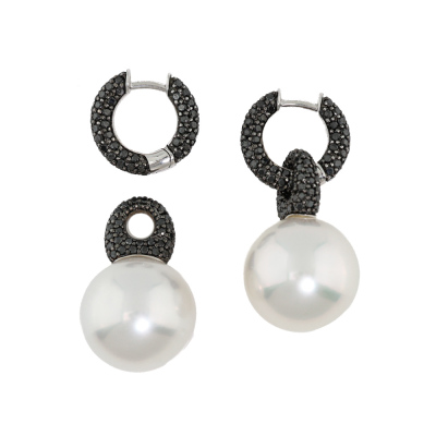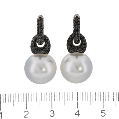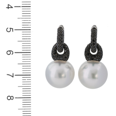 Autore detachable earrings with near round Australian South Sea Pearls of 12.9mm and 161 round Natural black Diamonds totalling 0.84ct. 18ct white gold with black rhodium plating. Drop length: 2.7cm. Weight: 11.3g. With Autore Certificate & box.