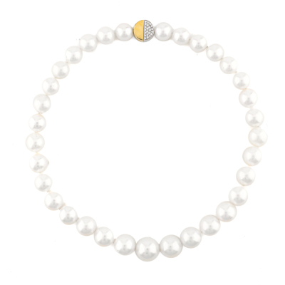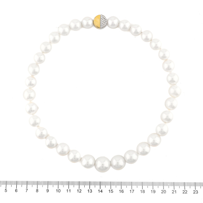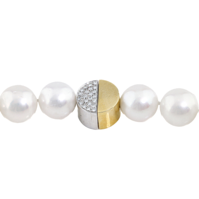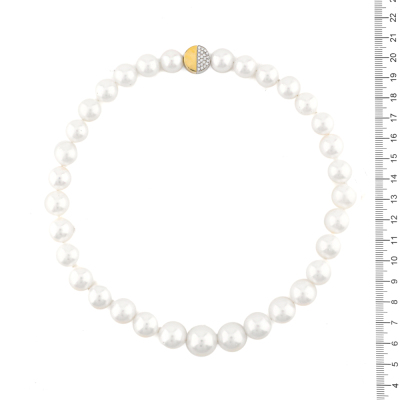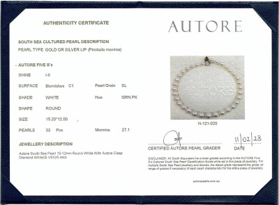 Autore Pearl Necklace with 33 graduated white round South Sea Pearls from 15.2mm - 12.0mm. Autore 18ct yellow and white gold clasp with round Natural Diamonds totalling 0.44ct (Estimated grading: G VS). Length: 45cm. Weight: 109.0g. With Autore Certificate #N-121-020. (As New)