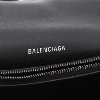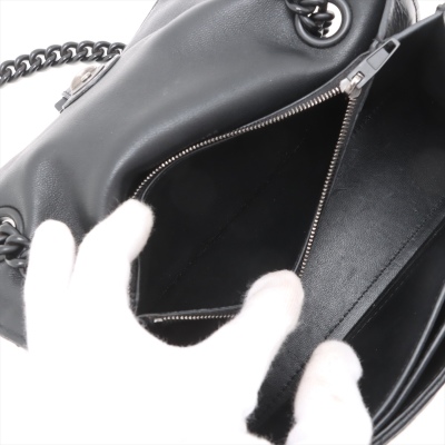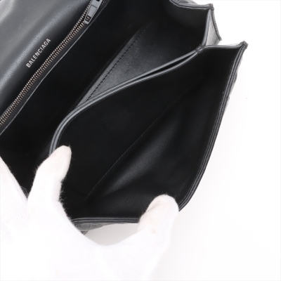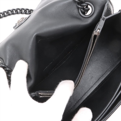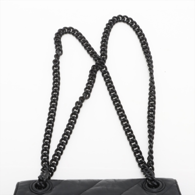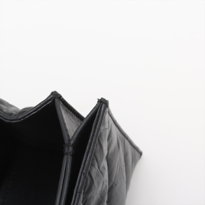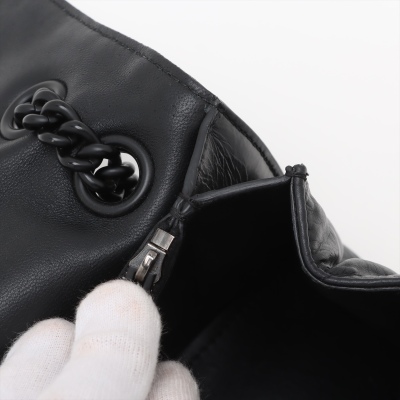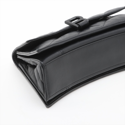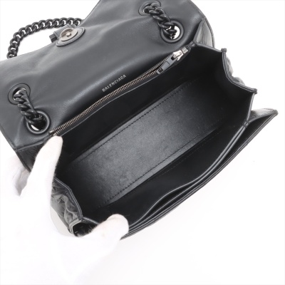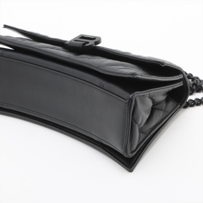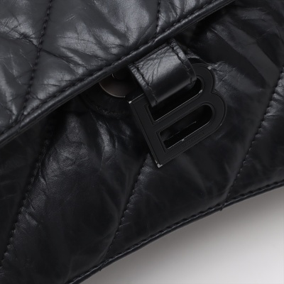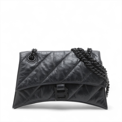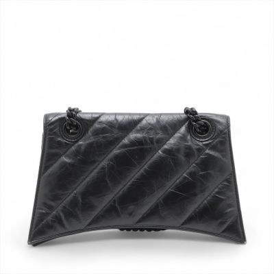 Balenciaga small crush chain bag in black quilted crushed calfskin. Featuring black matte hardware, sliding shoulder/crossbody chain, curve shape base. Frontal flap with B logo detailed magnetic button opens to leather lining 2 compartments interior divided by a centre pocket. Approx dimensions: 25cm(L) x 15cm(H) x 9cm(D), 53cm sliding chain drop. Accompanied by a dust bag. With Entrupy Certificate of Authenticity. (Pre-owned)