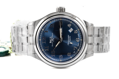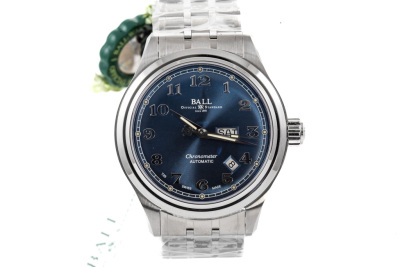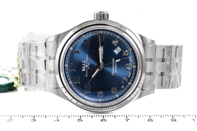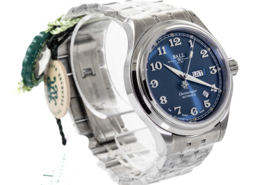 Ball Trainmaster Cleveland Express stainless steel automatic mens watch. Blue dial, day and date, case diameter: 41mm, wrist size: 19cm, Swiss made. Ref# NM1058D-SCJ-BE. With Ball stainless steel bracelet and clasp. With Premium International Warranty Certificate Card, Ball Chronometer Certificate Card and Ball box. 12 month FSA warranty. (As new, Note: case and bracelet in original wrapping)