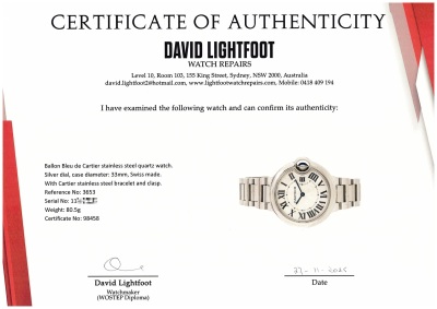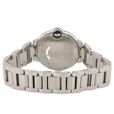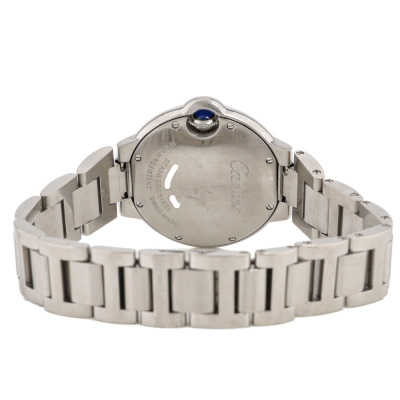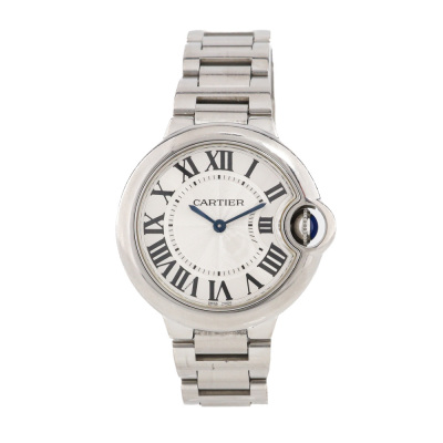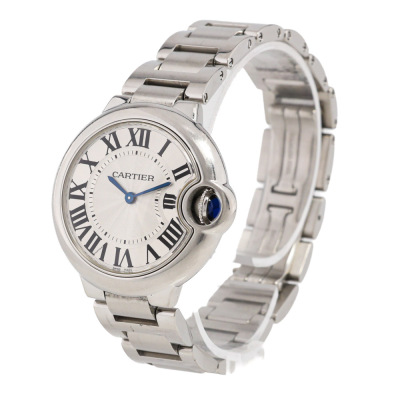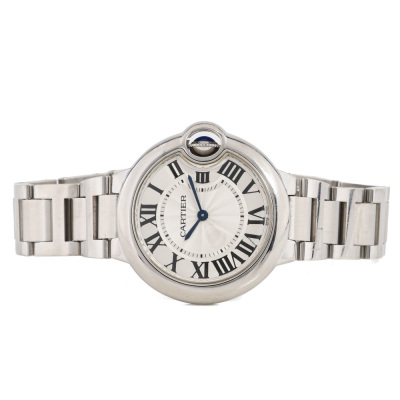 Ballon Bleu de Cartier stainless steel quartz ladies watch. Silver dial, case diameter: 33mm, wrist size: 17.5cm, Swiss made. Ref# 3653. With Cartier stainless steel bracelet and clasp. With Certificate of Authenticity. 3 month FSA warranty. Weight: 80.5g. (Pre-owned)