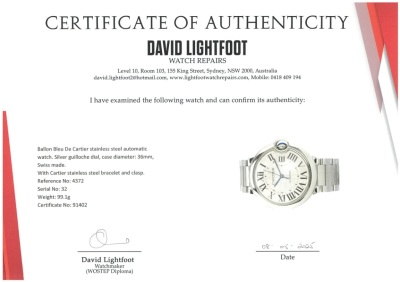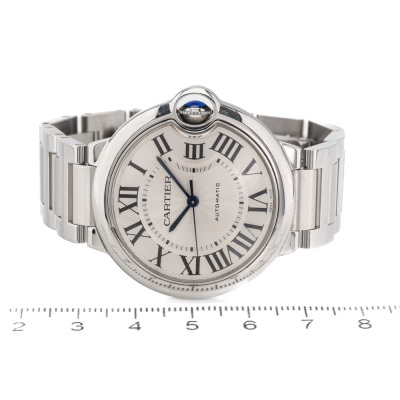 Ballon Bleu De Cartier stainless steel automatic watch. Silver guilloche dial, case diameter: 36mm, wrist size: 15cm, Swiss made. Ref# 4372. With Cartier stainless steel bracelet and clasp. With Certificate of Authenticity. 3 month FSA warranty (Pre-owned)