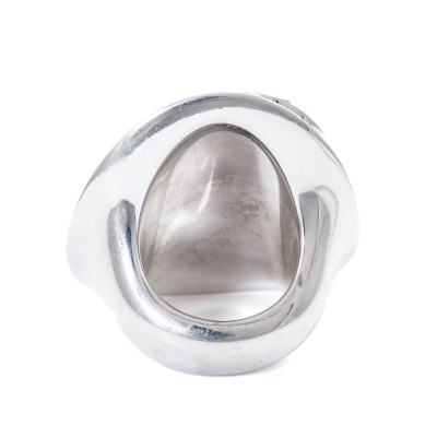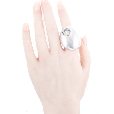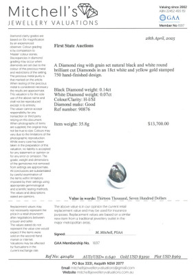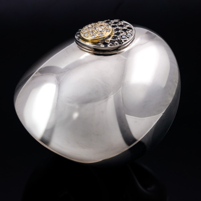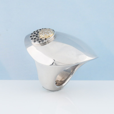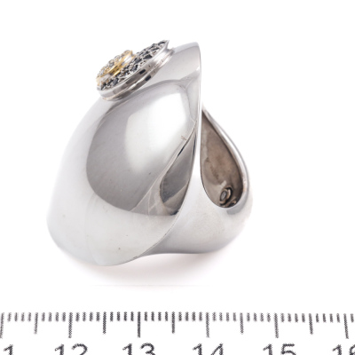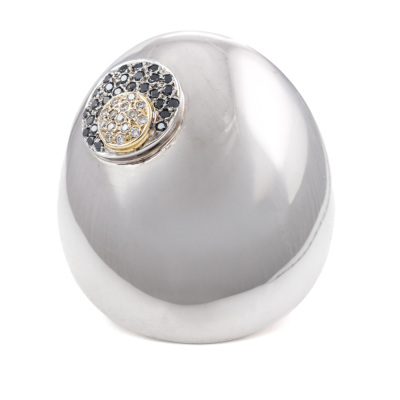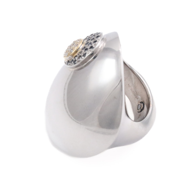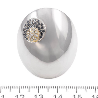 Dome design ring with round Natural Black Diamonds totalling approximately 0.14ct (Note - black Diamond maybe treated) and round Natural White Diamonds totalling approx. 0.07ct. 18ct white and yellow gold. Dome dimension: approximately 3.8cm x 3.2cm. Ring size K1/4 - Ring resizing is not recommended. Band width: 8.3mm - 9mm. With a round Natural Diamond of approximately 0.01ct inside ring band. Weight: 35.8g. Engraved 'BENSIMON' inside band. #420482. (Pre-owned)