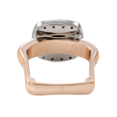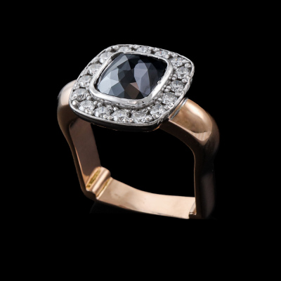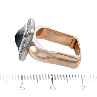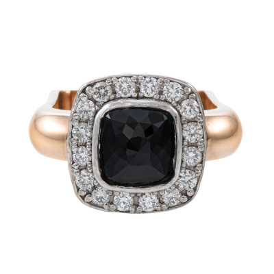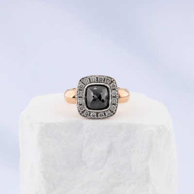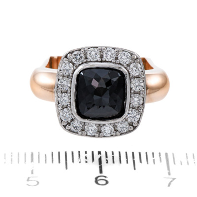 Black Diamond halo ring with pyramid shape Natural Black Diamond of diameter 7.5 x 7.5mm, and round Natural white Diamonds totalling approximately 0.48ct (Estimated grading: G-H VS). 18ct rose and white gold. Square shape ring band, Ring size: L. Band width: 3.4mm. Weight: 11.8g. (Pre-owned)
