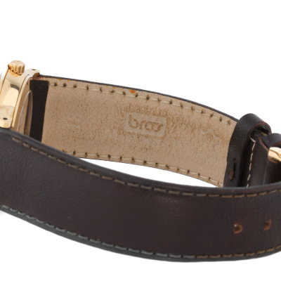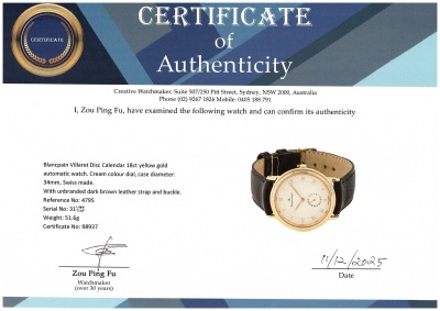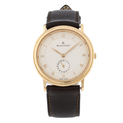 Blancpain Villeret Disc Calendar 18ct yellow gold automatic watch. Cream colour dial, case diameter: 34mm, wrist size: 19.5cm, Swiss made. Ref# 4795. With unbranded dark brown leather strap and buckle. With Certificate of Authenticity. 3 month FSA warranty. Weight: 51.6g