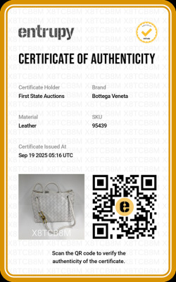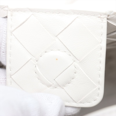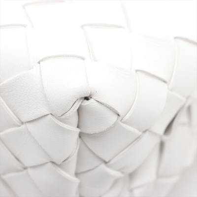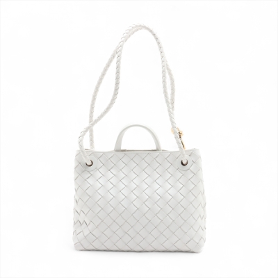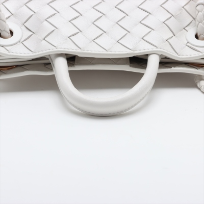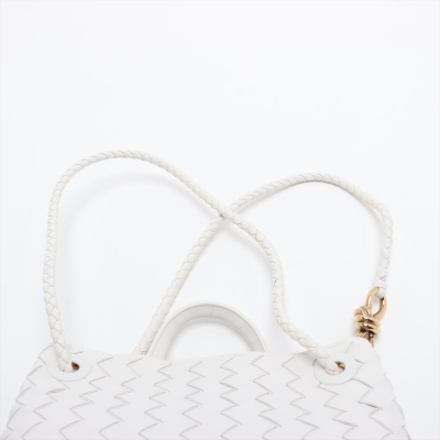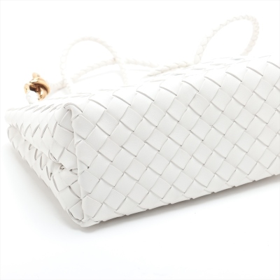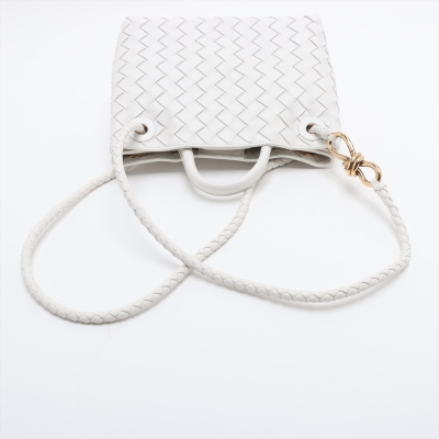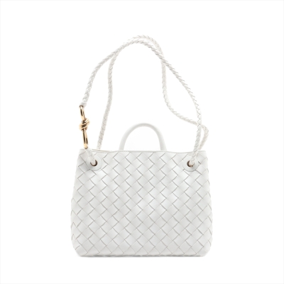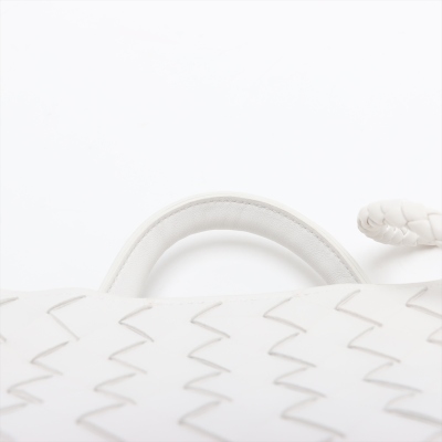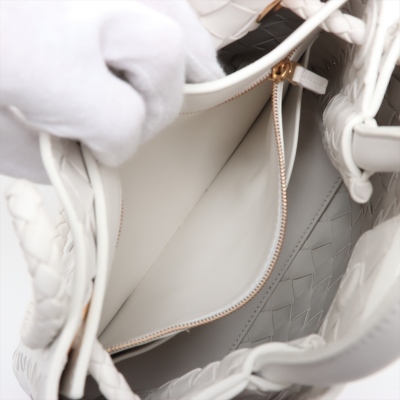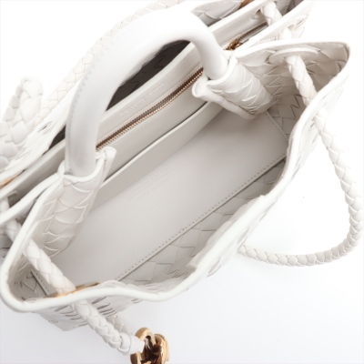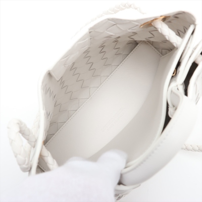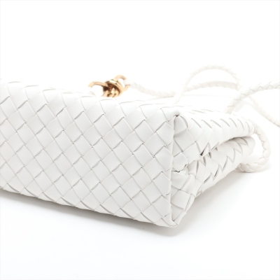 Bottega Veneta small Andiamo bag in white, intrecciato lambskin. Featuring gold-toned hardware, single top handle, and sliding cross-body strap with gold knot clasp. The magnetic closure opens to a white leather interior compartmented by a hanging divider with zipper and patched pockets. Approx. dimensions: 24cm(L) x 19cm(H) x 12cm(D), handle drop 5cm, doubled shoulder strap drop: 25cm. Accompanied by BV dustbag. With Entrupy Certificate of Authenticity. (Pre-owned)