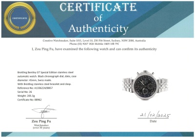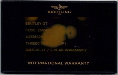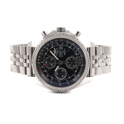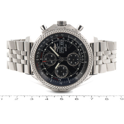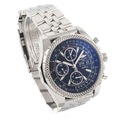 Breitling Bentley GT Special Edition stainless steel automatic mens watch. Black chronograph dial, date, case diameter: 45mm, wrist size: 20cm, Swiss made. Ref# A1336224/BB57. With Breitling stainless steel and clasp. With Certificate of Authenticity, Breitling e-warranty card dated 11/01/2014, and Breitling box. 3 month FSA warranty. (Pre-owned)