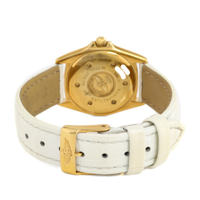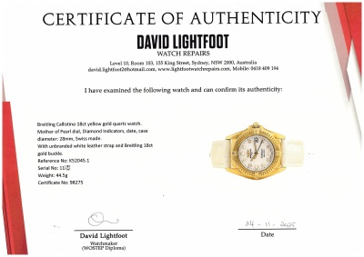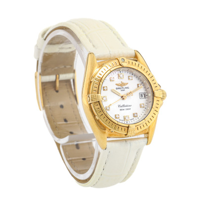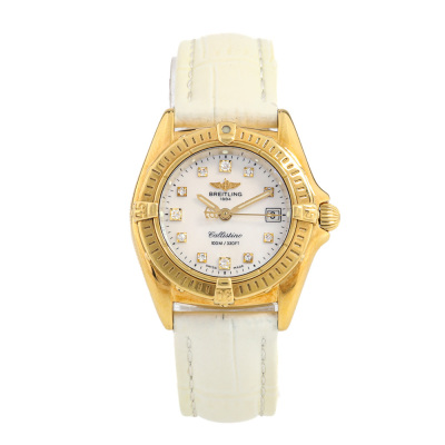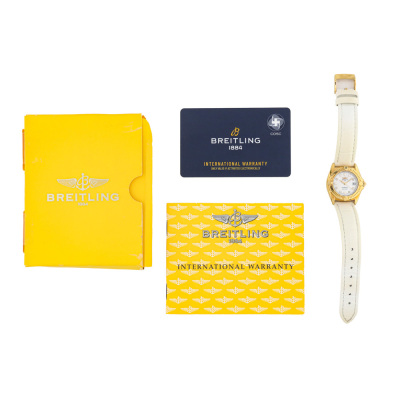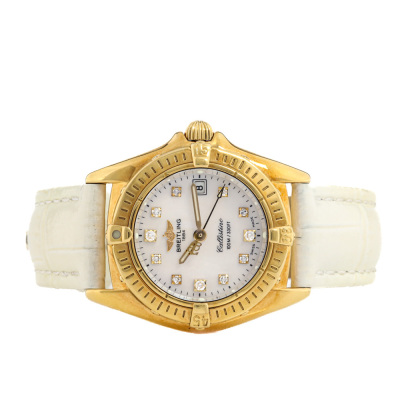 Breitling Callistino 18ct yellow gold quartz ladies watch. Mother of Pearl dial, Diamond Indicators, date, case diameter: 28mm, max wrist size: 17cm, Swiss made. Ref# K52045.1. With unbranded white leather strap and Breitling 18ct gold buckle. With Certificate of Authenticity, Breitling International warranty booklet dated 04/08/2007, Breitling International Warranty card and Breitling box. 3 month FSA warranty. Weight: 44.5g. (Pre-owned)