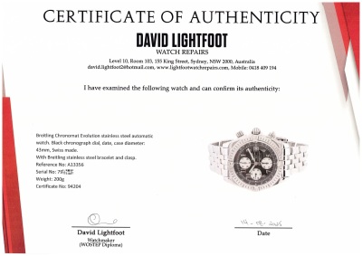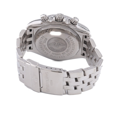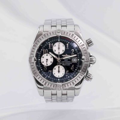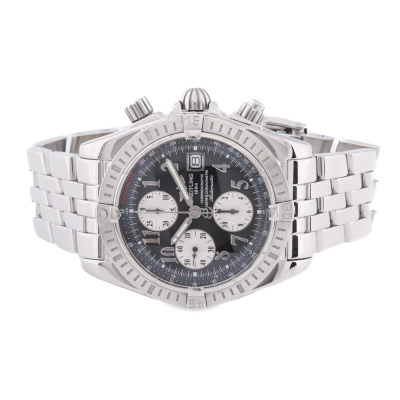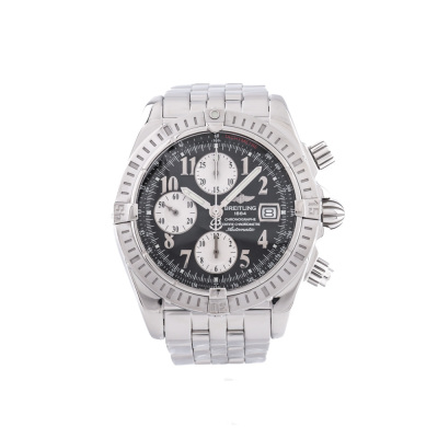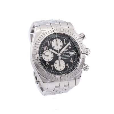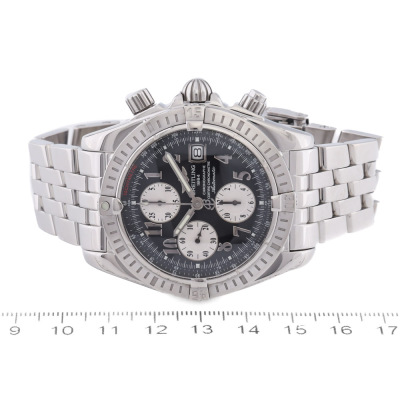 Breitling Chronomat Evolution stainless steel automatic mens watch. Black chronograph dial, date, case diameter: 43mm, wrist size: 17cm, Swiss made. Ref# A13356. With Breitling stainless steel bracelet and clasp. With Certificate of Authenticity and Breitling box. 3 month FSA warranty. (Pre-owned)