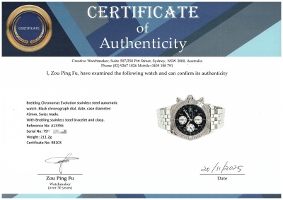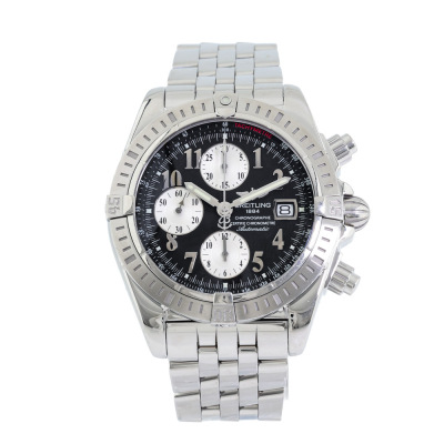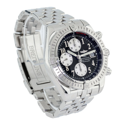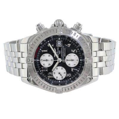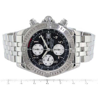 Breitling Chronomat Evolution stainless steel automatic mens watch. Black chronograph dial, date, case diameter: 44mm, wrist size: 20cm, Swiss made. Ref# A13356. With Breitling stainless steel bracelet and clasp. With Certificate of Authenticity and Breitling box. 3 month FSA warranty. Weight: 211.2g. (Pre-owned)