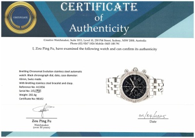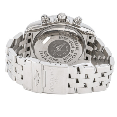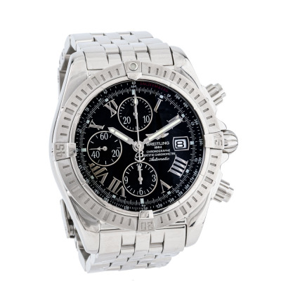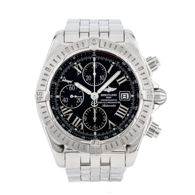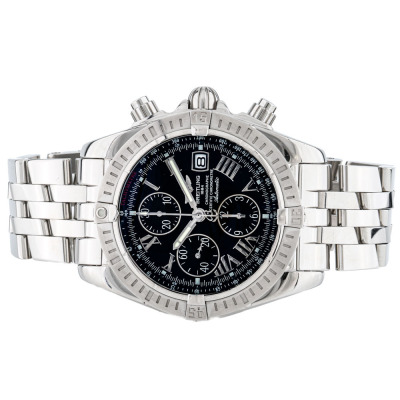 Breitling Chronomat Evolution stainless steel automatic mens watch. Black chronograph dial, date, case diameter: 43mm, wrist size: 17.5cm, Swiss made. Ref #A13356. With Breitling stainless steel bracelet and clasp. With Certificate of Authenticity. 3 month FSA warranty. Weight: 202.4g. (Pre-owned)