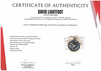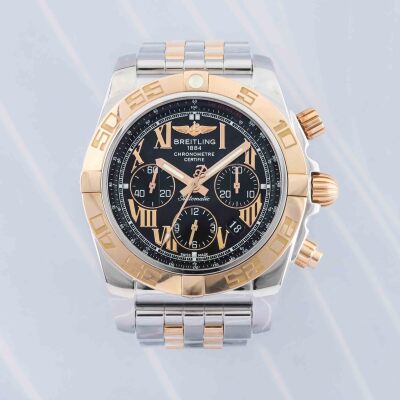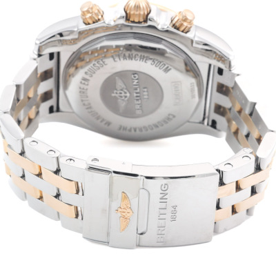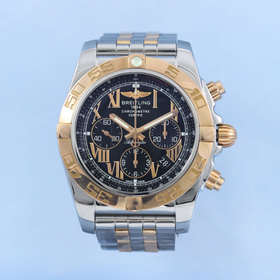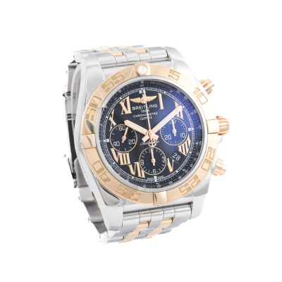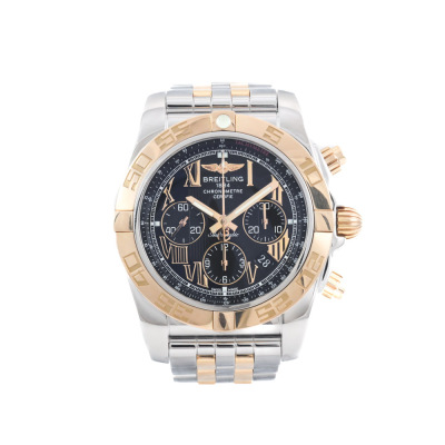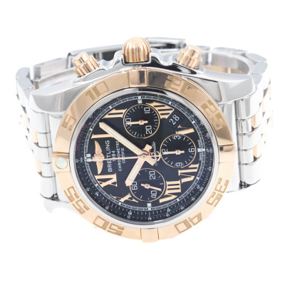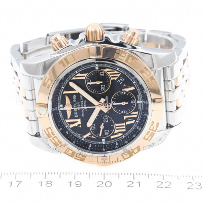 Breitling Chronomat 18ct rose gold and stainless steel automatic mens watch. Black chronograph dial, date, case diameter: 44mm, wrist size: 17cm, Swiss made. Ref# CB011012/B957. With Breitling two tone bracelet and clasp. With Certificate of Authenticity. 3 month FSA warranty. (Pre-owned)