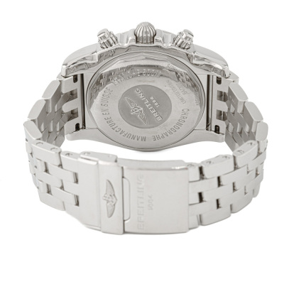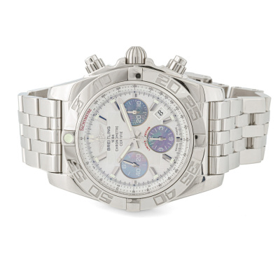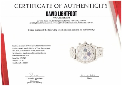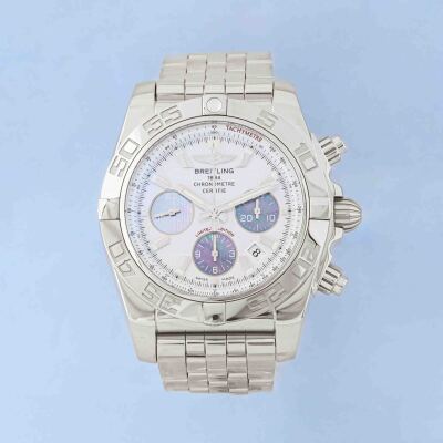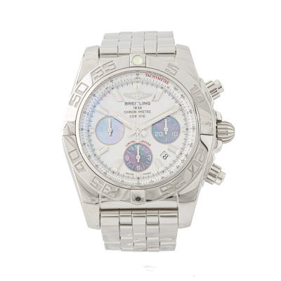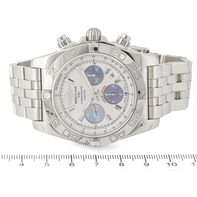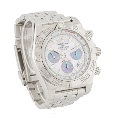 Breitling Chronomat 44 limited Edition of 300 stainless steel automatic mens watch. Mother of Pearl chronograph dial, date, case diameter: 44mm, wrist size: 19cm, Swiss made. Ref# AB0110. With Breitling stainless steel bracelet and clasp. With Certificate of Authenticity, Breitling International Warranty booklet dated 27/05/2011 and Breitling box. 3 month FSA warranty. (Pre-owned)
