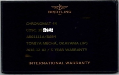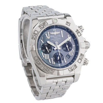 Breitling Chronomat Japan Limited edition of 500 stainless steel automatic mens watch. Blue Mother of Pearl chronograph dial, date, case diameter: 44mm, wrist size: 19.5cm, Swiss made. Ref# AB0111. With Breitling stainless steel bracelet and clasp. With Certificate of Authenticity, Breitling International E-warranty card dated 02/12/2018 and Breitling box. 3 month FSA warranty