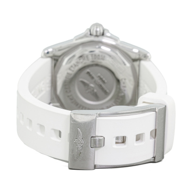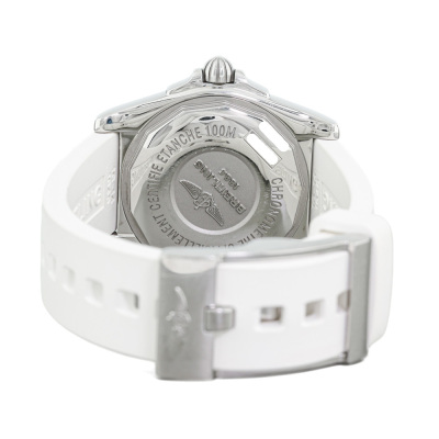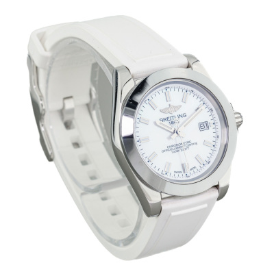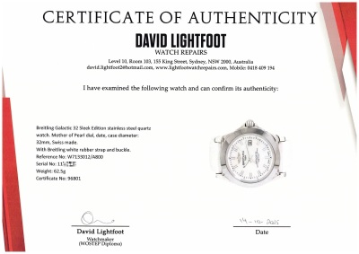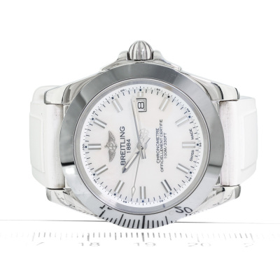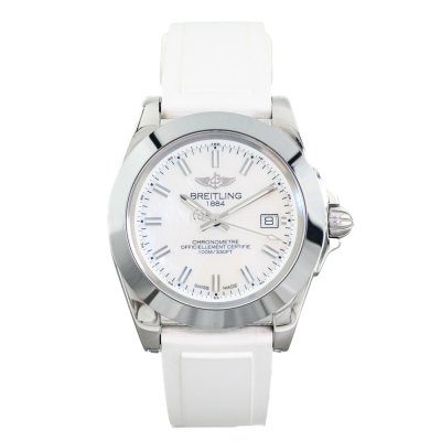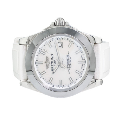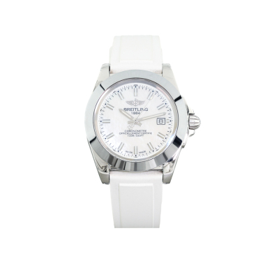 Breitling Galactic 32 Sleek Edition stainless steel quartz ladies watch. Mother of Pearl dial, date, case diameter: 32mm, max wrist size: 18.5cm, Swiss made. Ref# W7133012/A800. With Breitling white rubber strap and buckle. With Certificate of Authenticity, Breitling International E-warranty card dated 02/07/2018 and Breitling box. 3 month FSA warranty. Weight: 62.5g (Pre-owned)