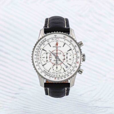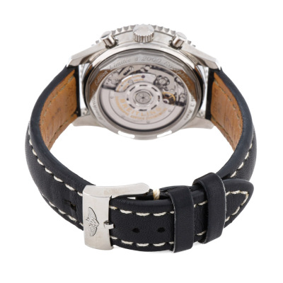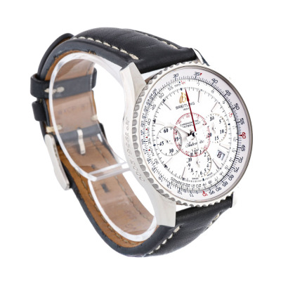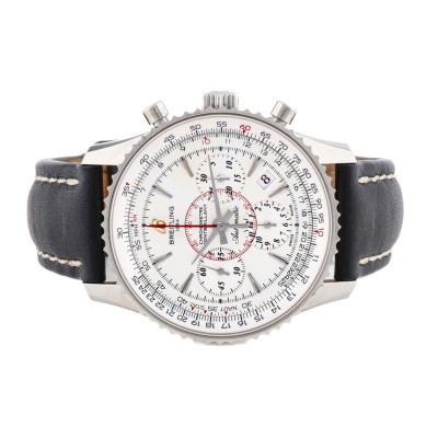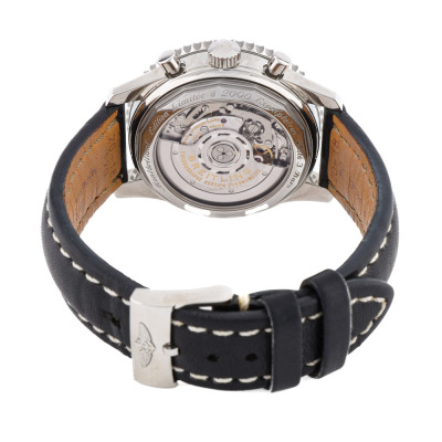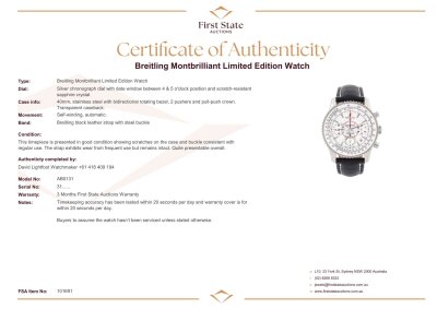 Breitling Montbrilliant Limited Edition of 2000 stainless steel automatic mens watch. Silver chronograph dial, date, case diameter: 40mm, max wrist size: 19.5cm, Swiss made. Ref# AB0131. With Breitling black leather strap and clasp. With Certificate of Authenticity. 3 month FSA warranty