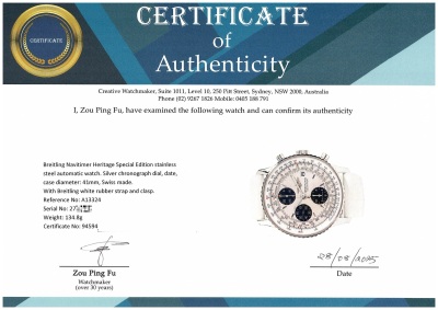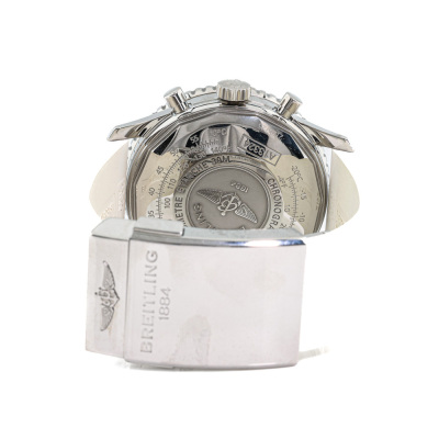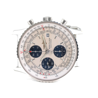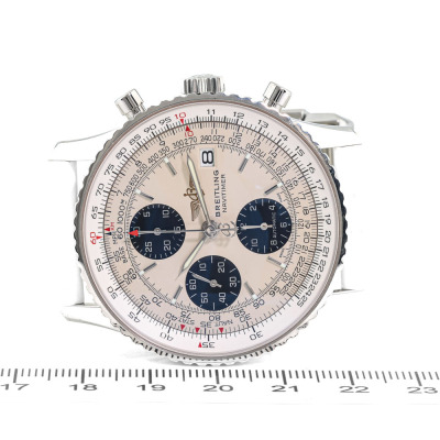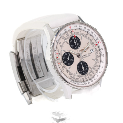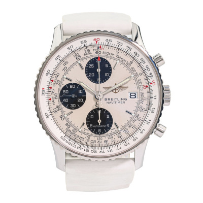 Breitling Navitimer Heritage stainless steel automatic mens watch. Silver chronograph dial, date, case diameter: 41mm, wrist size: 15.5cm, Swiss made. Ref# A13324. With Breitling white rubber strap and clasp. With Certificate of Authenticity and Breitling box. 3 month FSA warranty (Pre-owned)