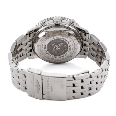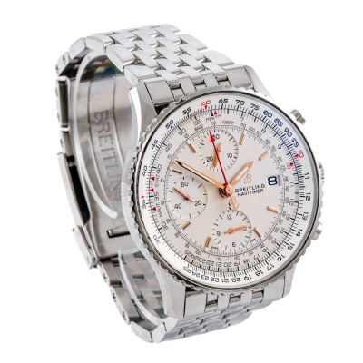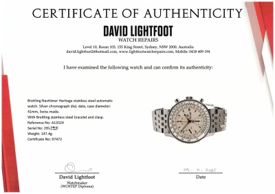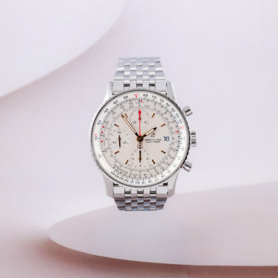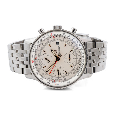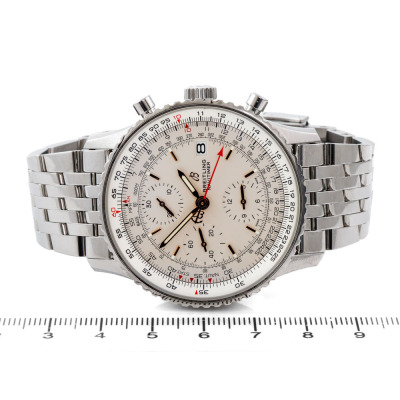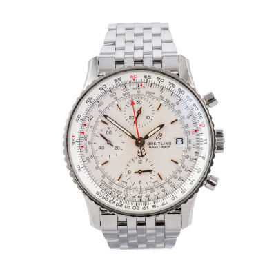 Breitling Navitimer Heritage stainless steel automatic mens watch. Silver chronograph dial, date, case diameter: 41mm, wrist size: 19cm, Swiss made. Ref# A13324. With Breitling stainless steel and clasp. With Certificate of Authenticity. 3 month FSA warranty. Weight: 147.4g (Pre-owned)