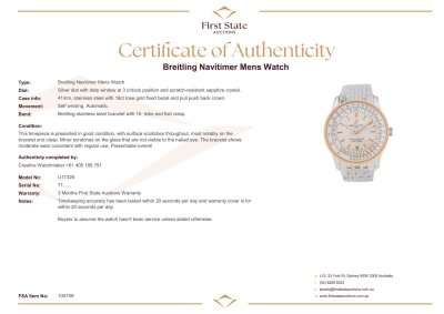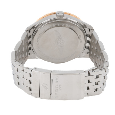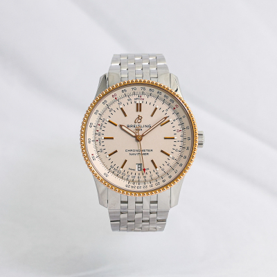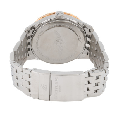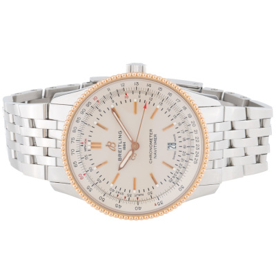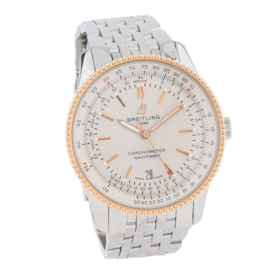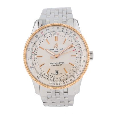 Breitling Navitimer 18ct rose gold and stainless steel automatic mens watch. Silver dial, date, case diameter: 41mm, wrist size: 18cm, Swiss made. Ref# U17326. With Breitling stainless steel bracelet and clasp. With Certificate of Authenticity. 3 month FSA warranty. Weight: 133.1g.
