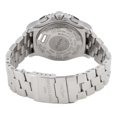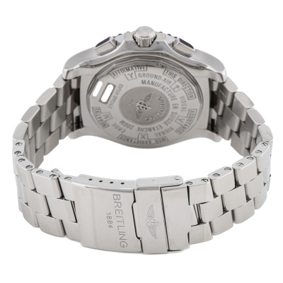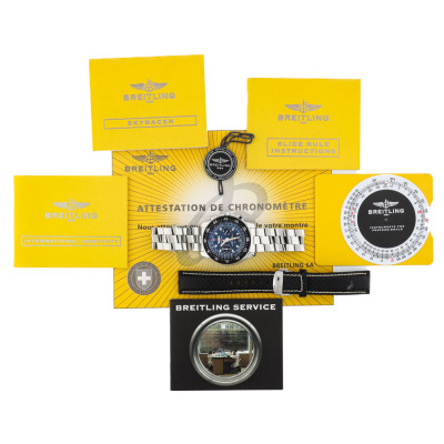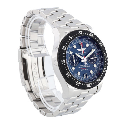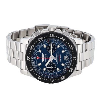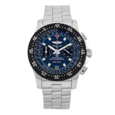 Breitling Skyracer Raven stainless steel automatic mens watch. Blue chronograph dial, date, case diameter: 43mm, wrist size: 21cm, Swiss made. Ref# A27364. With Breitling stainless steel bracelet and clasp. With Certificate of Authenticity, Breitling International Warranty Booklet dated 26/09/2013, spare unbranded black strap with clasp and Breitling box. 3 month FSA warranty. Weight: 221.1g.