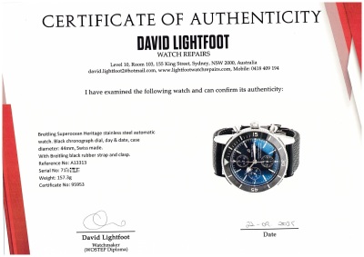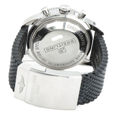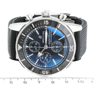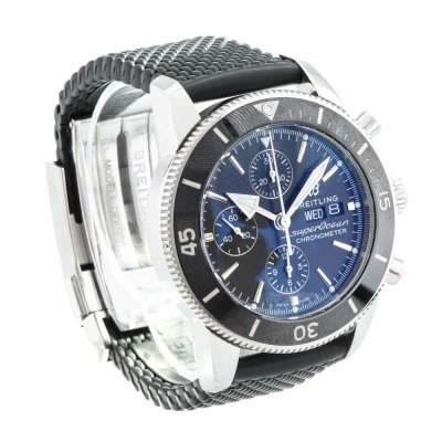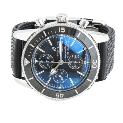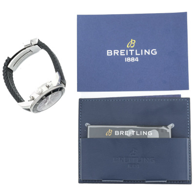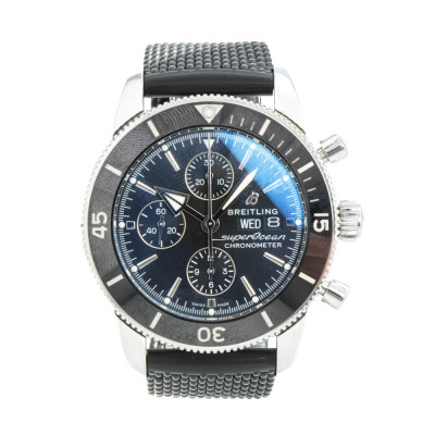 Breitling Superocean Heritage stainless steel automatic watch. Black chronograph dial, day & date, case diameter: 44mm, max wrist size: 16.5cm, Swiss made. Ref# A13313. With Breitling black rubber strap and clasp. With Certificate of Authenticity, Breitling International E-warranty card dated 25/09/2020 and Breitling box. 3 month FSA warranty (Pre-owned)
