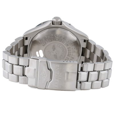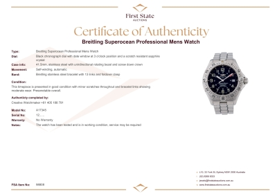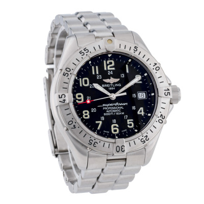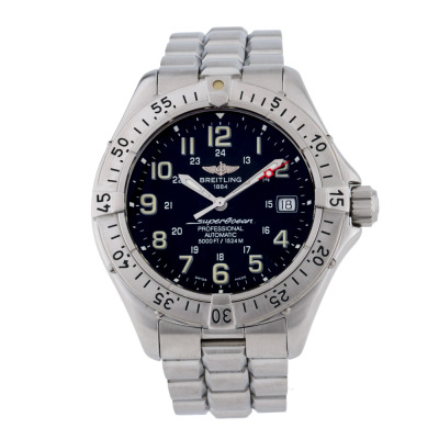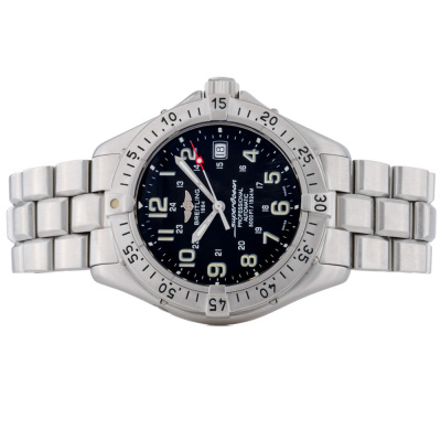 Breitling Superocean Professional stainless steel mens watch. Black dial, date, case diameter: 41.5mm, wrist size: 17.5cm, Swiss made. Ref #A17345. With Breitling stainless steel bracelet and clasp. With Certificate of Authenticity and Breitling case. No warranty applies. Weight: 170.8g.