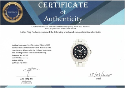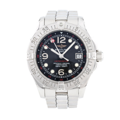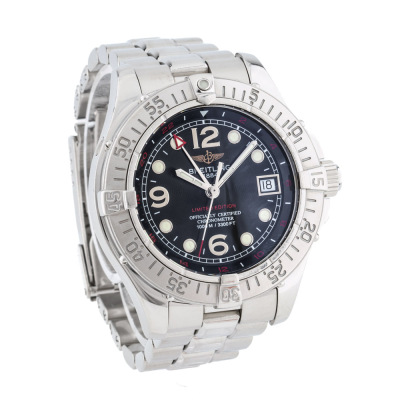 Breitling Superocean Steelfish Limited Edition of 200 stainless steel automatic mens watch. Black dial, date, case diameter: 42mm, wrist size 15.5mm, Swiss made. Ref# A32360. With Breitling stainless steel bracelet and clasp. With Certificate of Authenticity. 3 month FSA warranty. Weight: 166.3g. (Pre-owned)