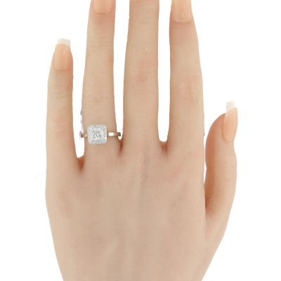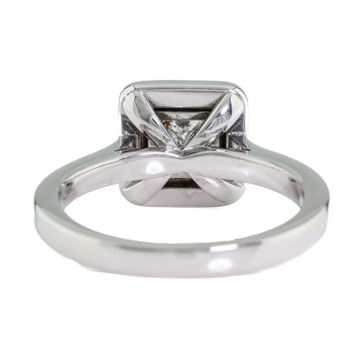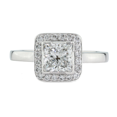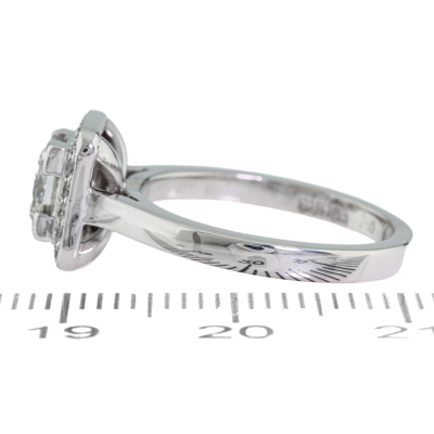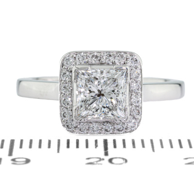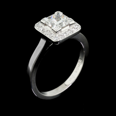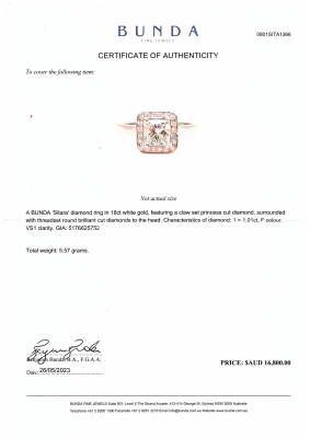 Bunda Diamond halo ring with a centre princess cut Natural Diamond of 1.01ct (with Copy of GIA Diamond Report graded as F VS1 #5176625752) and remaining round Natural Diamonds totalling approximately 0.20ct. 18ct white gold. Ring size J1/2. Band width: 2.2mm. Weight: 5.3g. With Bunda pouch and Bunda Certificate dated 26/05/23. (Pre-owned)
