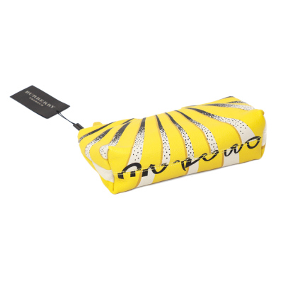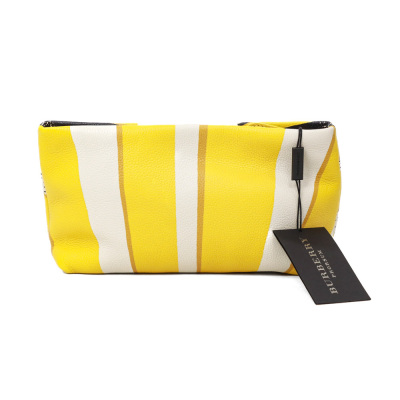 Burberry Prorsum Summer clutch in Daffodil yellow calfskin leather with sunray design. Featuring gold-toned hardware and zipper closure on top. This opens to a black textile interior with a patch pocket. Approximate dimensions: 25cm(Base-L) x 16cm(H) x 7cm(D). Accompanied by Burberry dustbag. With Entrupy Certificate of Authenticity. (Pre-owned)*