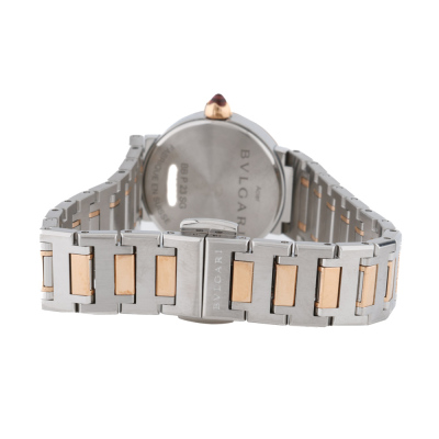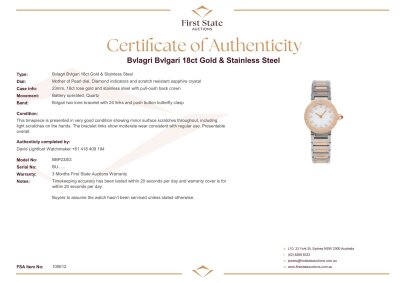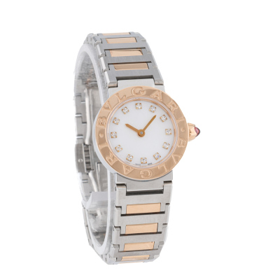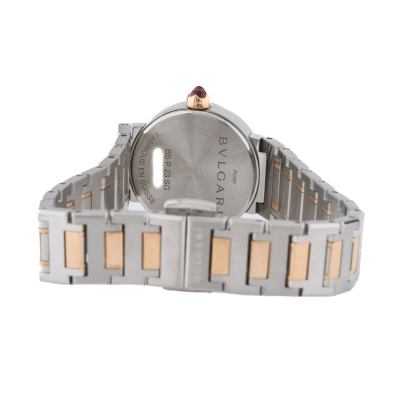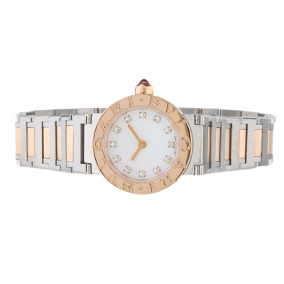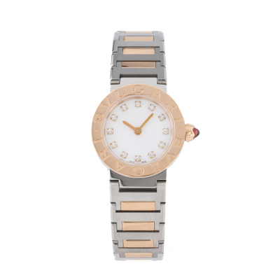 Bvlgari Bvlgari 18ct rose gold and stainless steel quartz ladies watch. Mother of Pearl dial, Diamond indicators, case diameter: 23mm, wrist size: 16.5cm, Swiss made. Ref# BBP23SG. With Bvlgari two tone bracelet and clasp. With Certificate of Authenticity and Bvlgari International Warranty & Authenticity Certificate dated 05/12/2022. 3 month FSA warranty. Weight: 54.5g