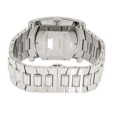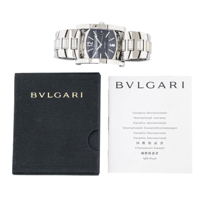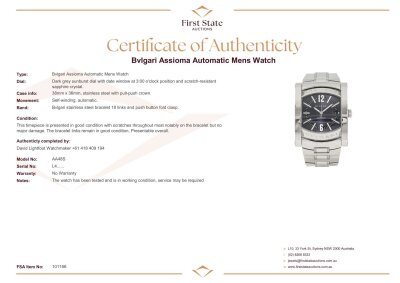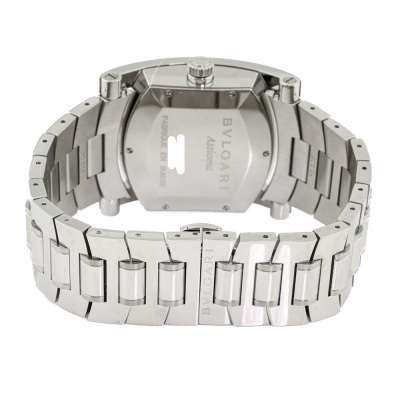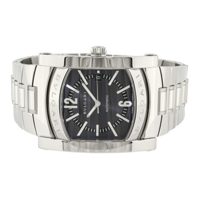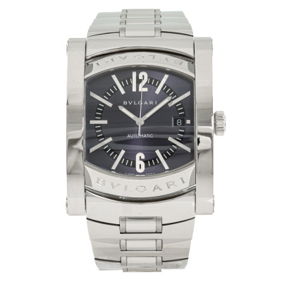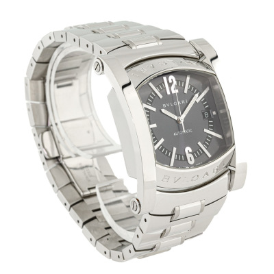 Bvlgari Assioma stainless steel automatic mens watch. Dark grey dial, date, approximate case diameter: 38mm x 36mm, wrist size: 19.5cm, Swiss made. Ref# AA48S. With Bvlgari stainless steel bracelet and clasp. With Certificate of Authenticity, undated Bvlgari International Warranty Booklet and Bvlgari box. No warranty applies