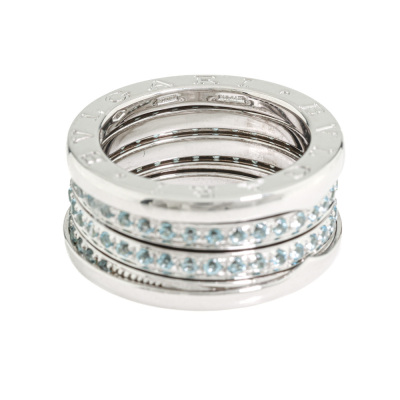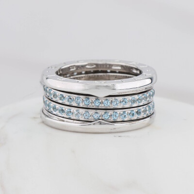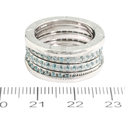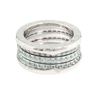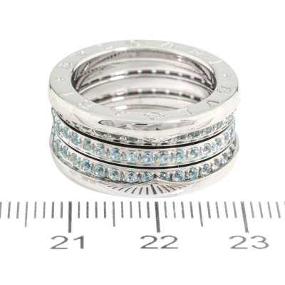 Bvlgari B. Zero1 ring with round cut Natural Blue Topaz totalling approximately 0.90ct. Bvlgari stamped size 54, measures as Australian size: M - ring resizing is not recommended. Band width: 10.4mm. 18ct white gold. Weight: 14.4g. (Pre-owned)
