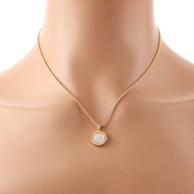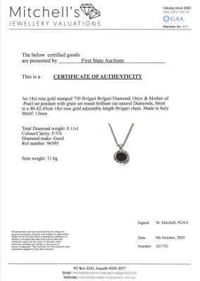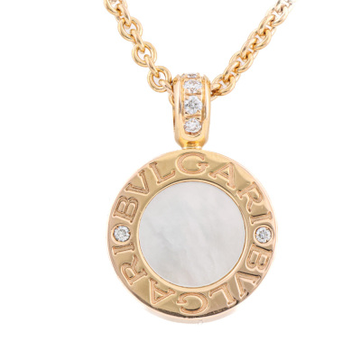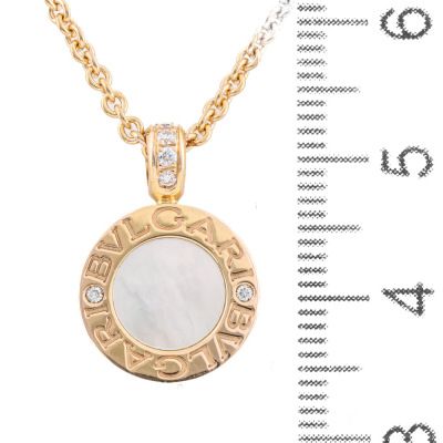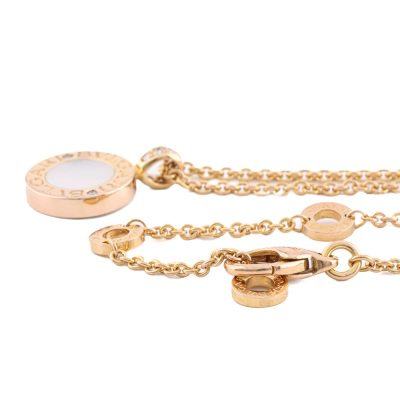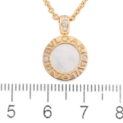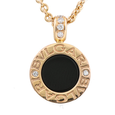 Bvlgari Bvlgari necklace with round Natural Diamonds totalling 0.11ct and round Onyx & round mother of pearl inlay on each side of the motif. Motif diameter size: 13mm. 18ct rose gold with Bvlgari 18ct rose gold 40cm - 42cm - 45cm adjustable chain. Made in Italy. Weight: 11.6g. With Certificate #421742. (Pre-owned)