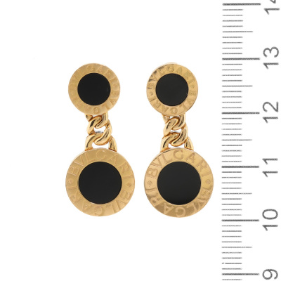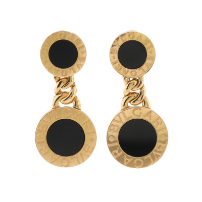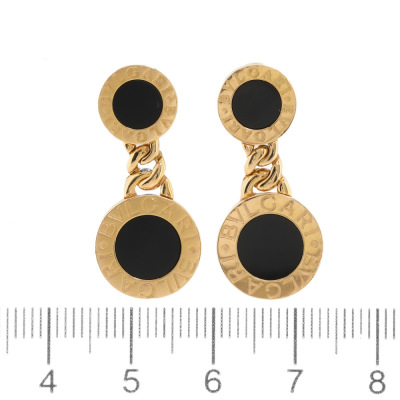 Bvlgari Bvlgari drop earrings with Onyx inlay. Drop length: 2.9cm. 18ct yellow gold with non-branded 18ct yellow gold backs. Made in Italy. Weight: 13.7g.