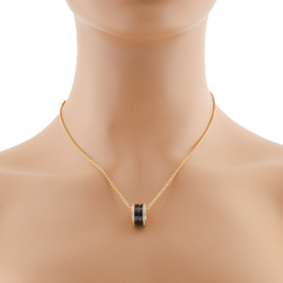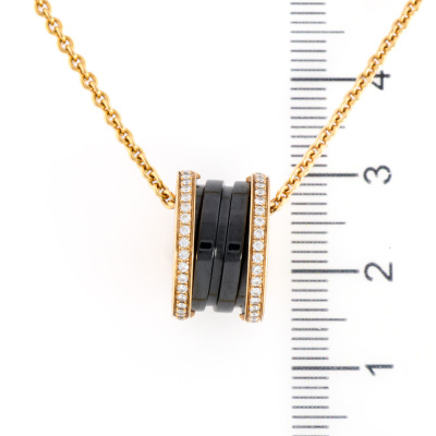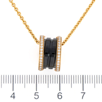 Bvlgari B.Zero1 necklace with black ceramic and round Natural Diamonds totalling 0.38ct (Estimated grading: F VS). 18ct rose gold with 39cm - 45cm Bvlgari 18ct rose gold adjustable chain. Pendant height: 1.5 cm. Made in Italy With Certificate #6255150720954852