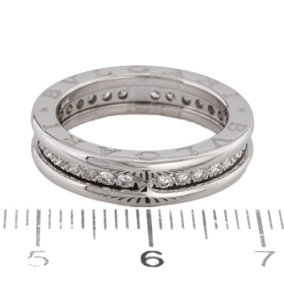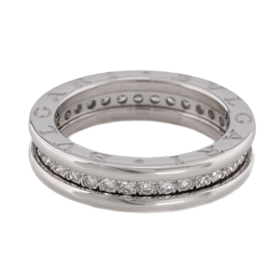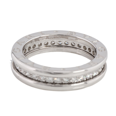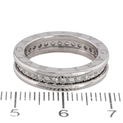 Bvlgari B.Zero1 one band ring with full hoop round Natural Diamonds totalling 0.45ct (Estimated grading: F-G VS). 18ct white gold. Bvlgari stamped size 51, Measures as Australian Size K - ring resizing is not recommended. Made in Italy. Weight: 6.2g. (Pre-owned)