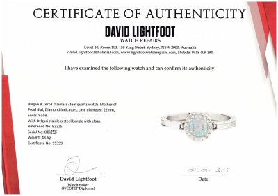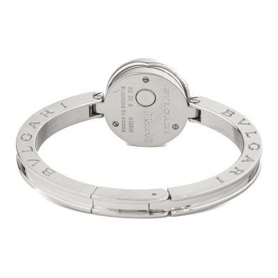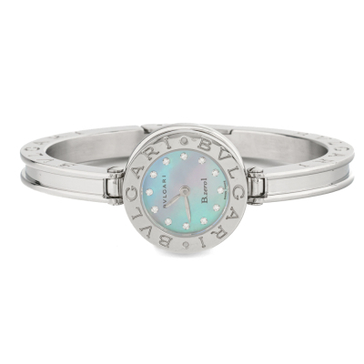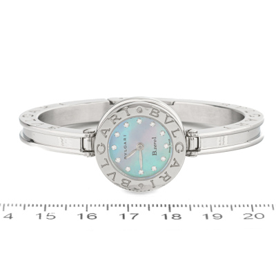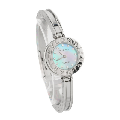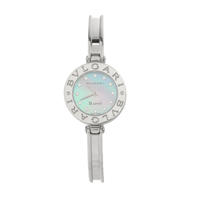 Bvlgari B.Zero1 stainless steel quartz ladies watch. Mother of Pearl dial, Diamond indicators, case diameter: 22mm, max wrist size: 14.5cm, Swiss made. Ref# BZ22S. With Bvlgari stainless steel bangle with clasp. With Certificate of Authenticity, undated Bvlgari International Guarantee booklet and Bvlgari box. No warranty applies. Weight: 43.6g (Pre-owned)
