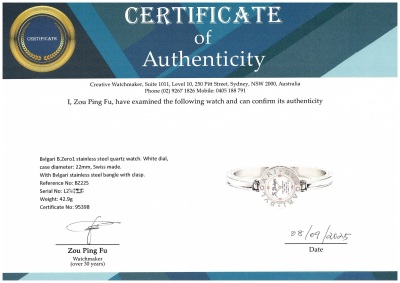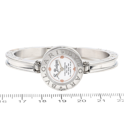 Bvlgari B.Zero1 stainless steel quartz ladies watch. White dial, case diameter: 22mm, wrist size: 14.5cm, Swiss made. Ref# BZ22S. With Bvlgari stainless steel bangle with clasp. With Certificate of Authenticity, undated Bvlgari International Warranty booklet and Bvlgari box. No warranty applies. (Pre-owned)