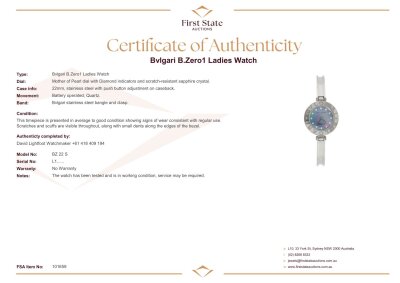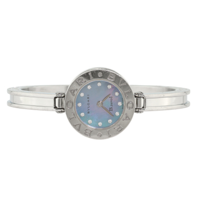 Bvlgari B.Zero1 stainless steel quartz ladies watch. Mother of Pearl dial, Diamond indicators, case diameter: 22mm, max wrist size: 14.5cm, Swiss made. Ref# BZ22S. With Bvlgari stainless steel bangle with clasp. With Certificate of Authenticity. No warranty applies